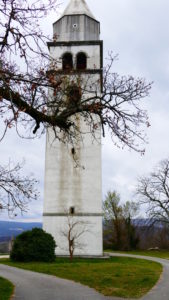 S „pijanih“ šina se polako spuštamo šumskim putem ponovno do ceste za Šušnjevicu jer želimo doći na drugu stranu polja, i to do bijelog zvonika na brdu. Ogroman je i prije nego dođete do njega, zamišljate veće mjesto koje bi ga krasilo. Međutim, ova grdosija od zvonika nalazi se u malom seocetu Brdo ili Brda nedaleko mjesta Ćepić.