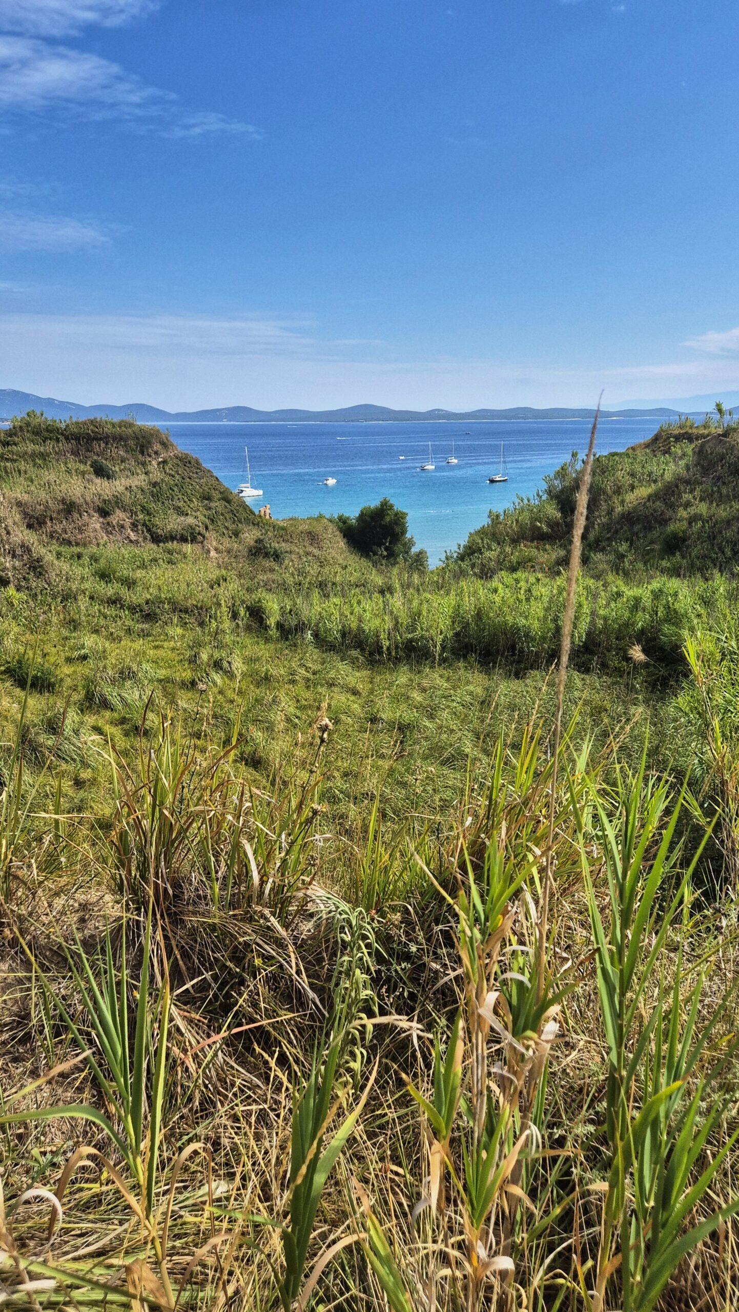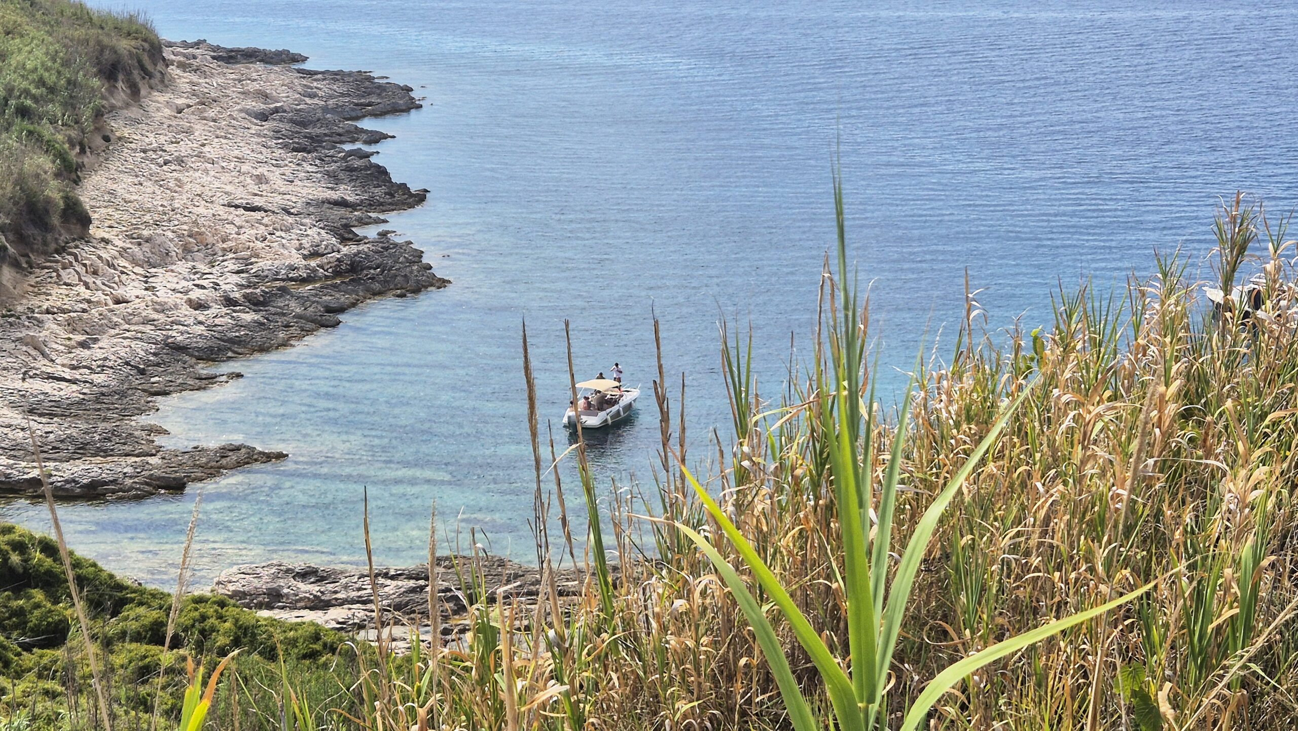 Tu smo skrenuli poludesno, kod ulaza u vinograd, i nakon 100 metara s lijeve strane otvorio nam se pogled prema gornjem selu. Nastavili smo još desetak minuta do najužeg dijela otoka i s lijeve strane ugledali more. Tu je križanje – cesta ide ravno, a dvije manje staze strmo se spuštaju prema uvalama na suprotnim stranama. Treba skrenuti lijevo i za 2–3 minute ste na Boku. Ako vam se ne ide tim putem, krenite iz donjeg sela prema istoku uz obalu i doći ćete do te divne plažice.